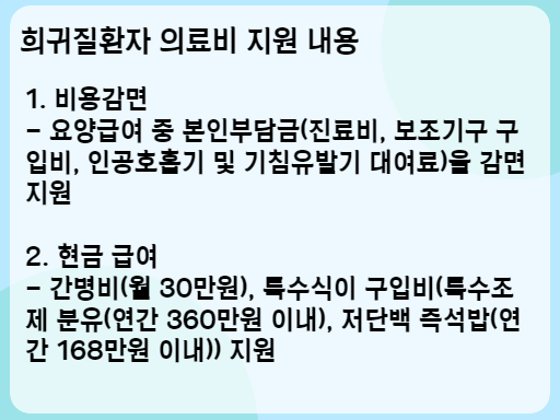 - 간병비(월 30만원), 특수식이 구입비(특수조제 분유(연간 360만원 이내), 저단백 즉석밥(연간 168만원 이내)) 지원